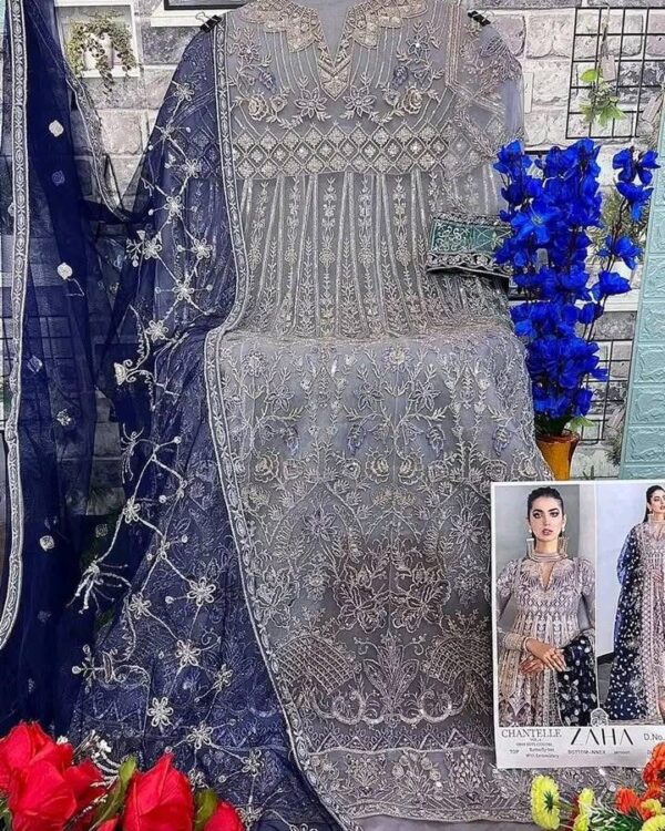 Dusty Grey And Navy Blue ZAHA Chantelle Pakistani Concept Embroidered Suit