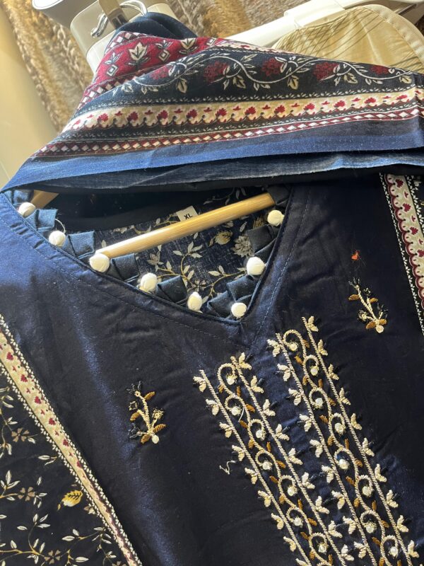 The cotton top is beautifully enhanced with self embroidery and fancy styling on the neckline and sleeves, giving it a graceful and sophisticated look. Paired with a comfortable stitched cotton pant, this ensemble ensures all-day ease. The outfit is completed with a cotton printed dupatta adorned with two-side lace, adding a touch of charm and femininity.